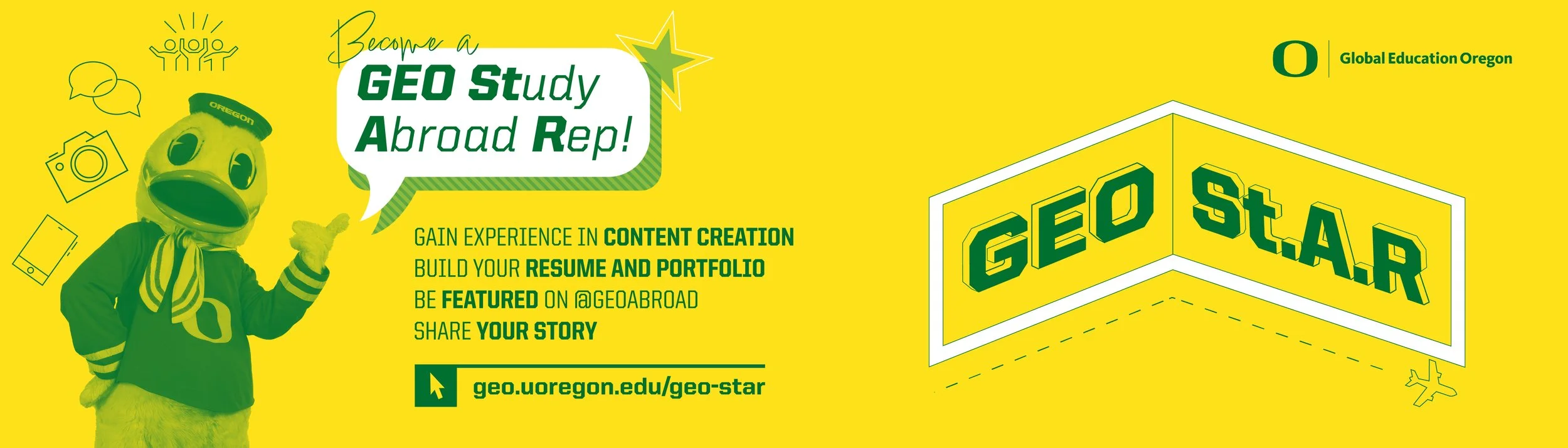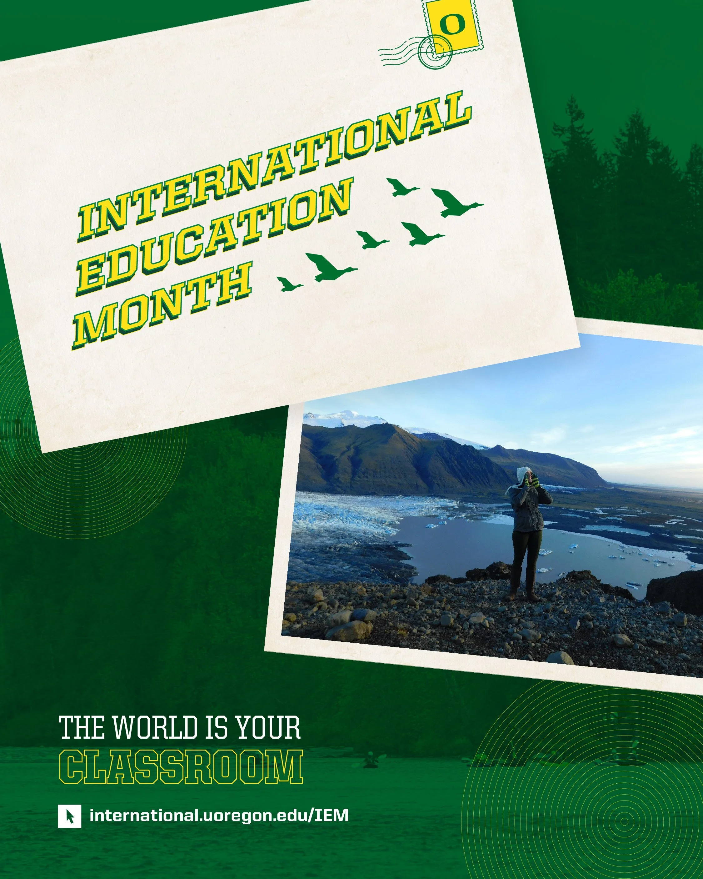 As the Communications Design Intern for the Division of Global Engagement, my responsibility for the past three years has been to visually communicate the department’s global initiatives and engage with the student body. My designs promote international growth and opportunities for UO students. I do this through reimagining the University’s brand in an innovative yet recognizable way.